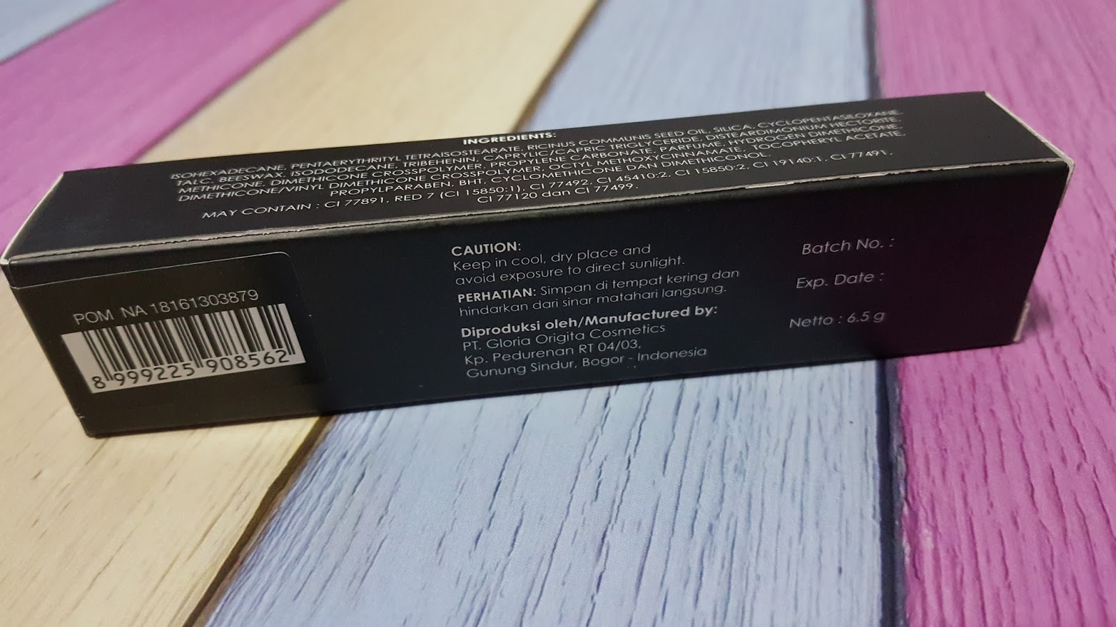 And at the back at the packaging box, you can see caution inatruction, manufacture information, BPOM barcode & number label, the expired date & product nett.
